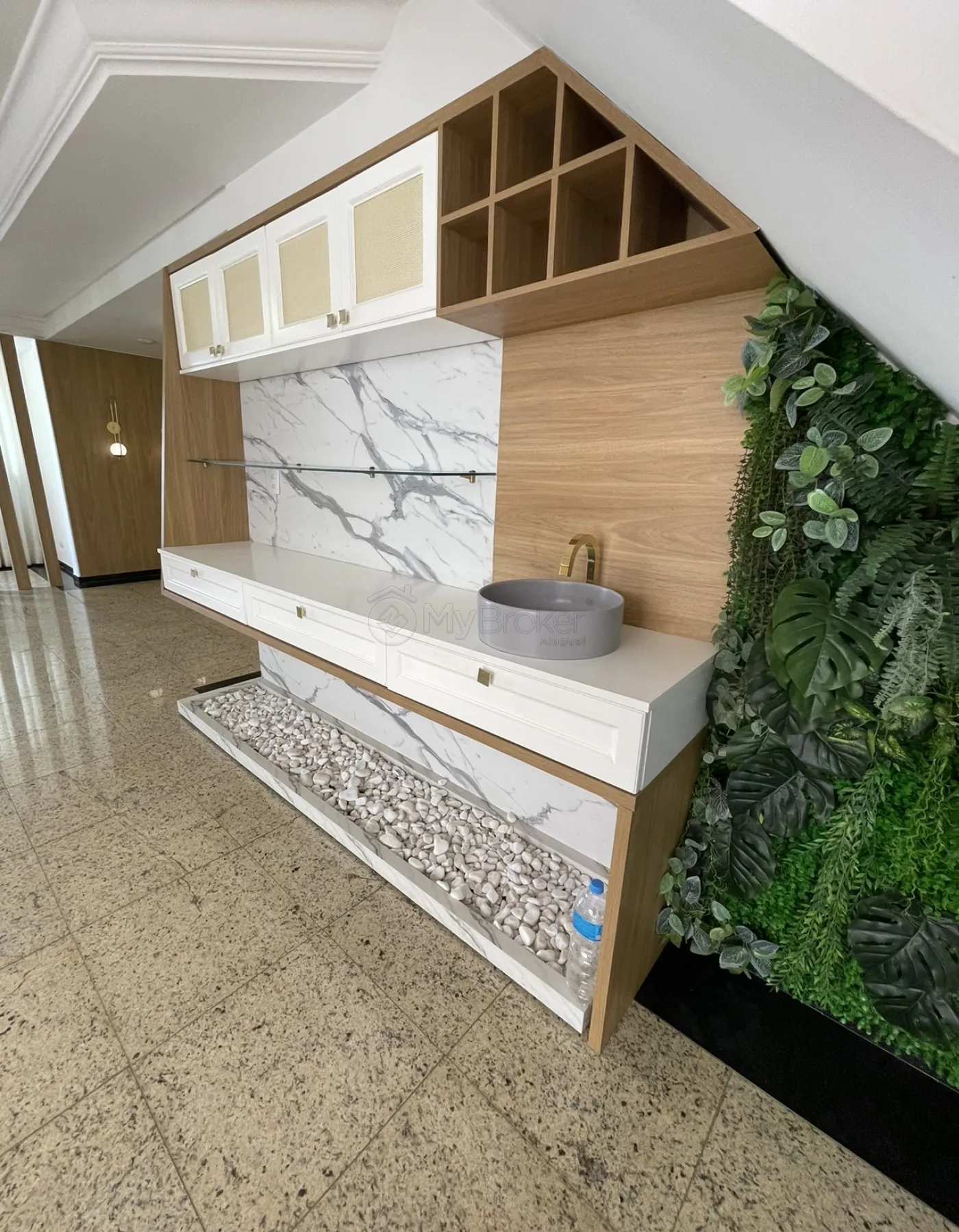 Além disso, a área superior da cobertura conta com uma piscina para momentos de lazer e relaxamento, um espaço gourmet para receber amigos e familiares, uma cozinha totalmente equipada e ainda um quarto adicional, ideal para acomodar ajudantes ou funcionários domésticos, garantindo praticidade e conforto para os moradores.
