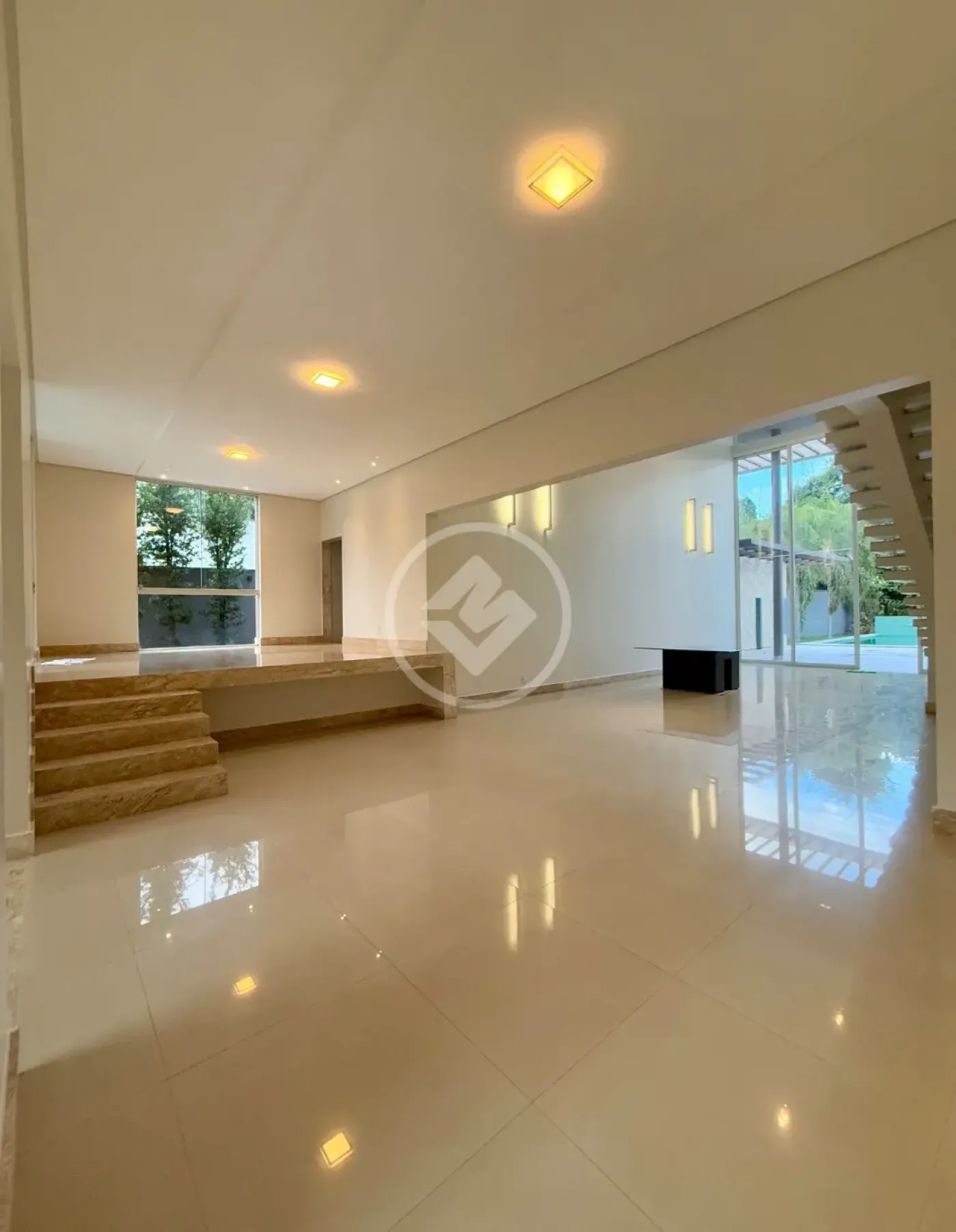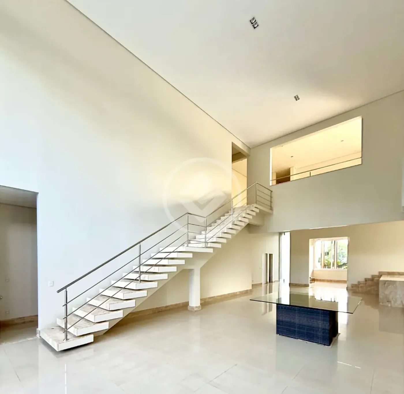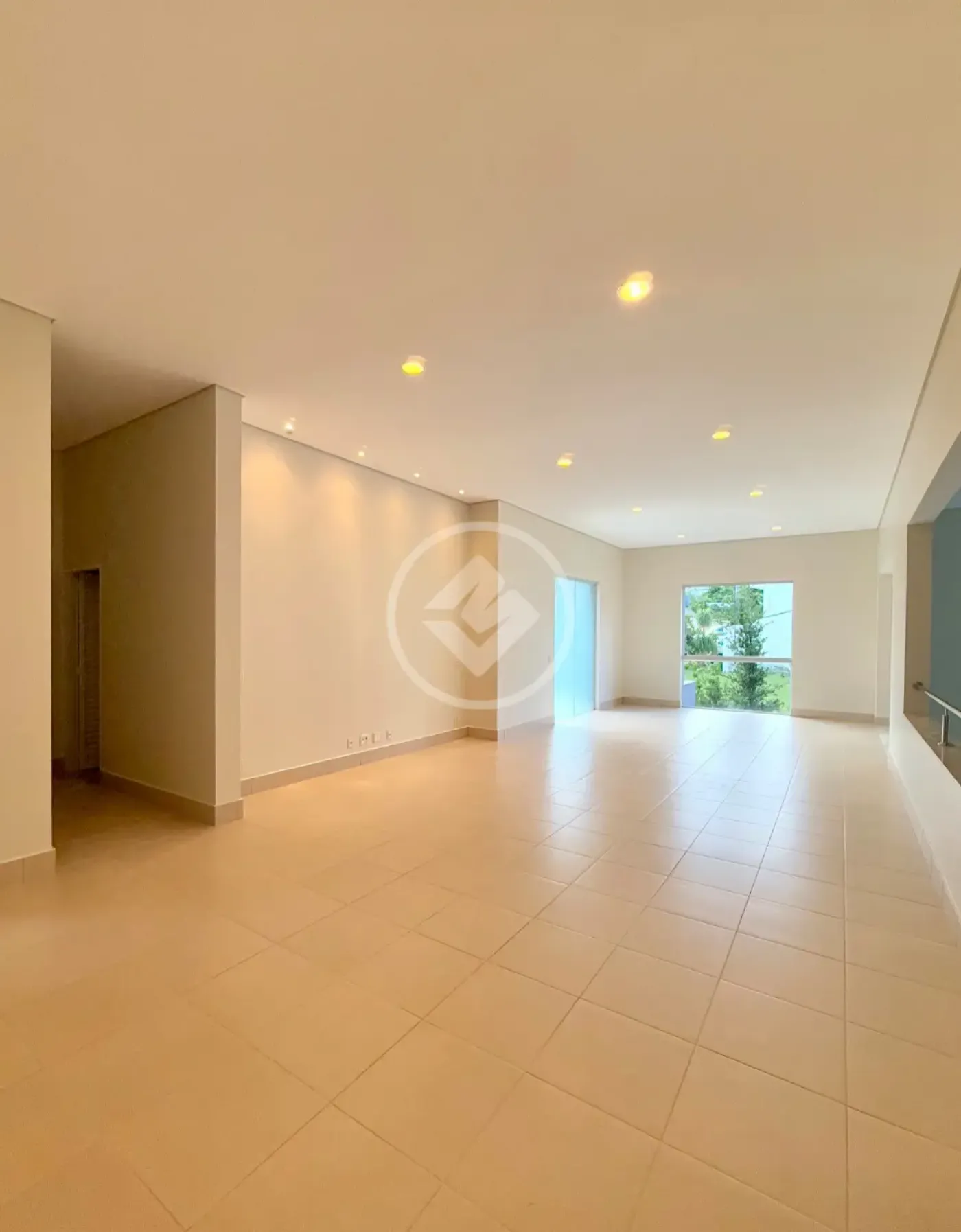 Sala de estar ampla para 4 ambientes, com 91m² e pé-direito de 7,60m, proporcionando grande luminosidade e sensação de espaço.