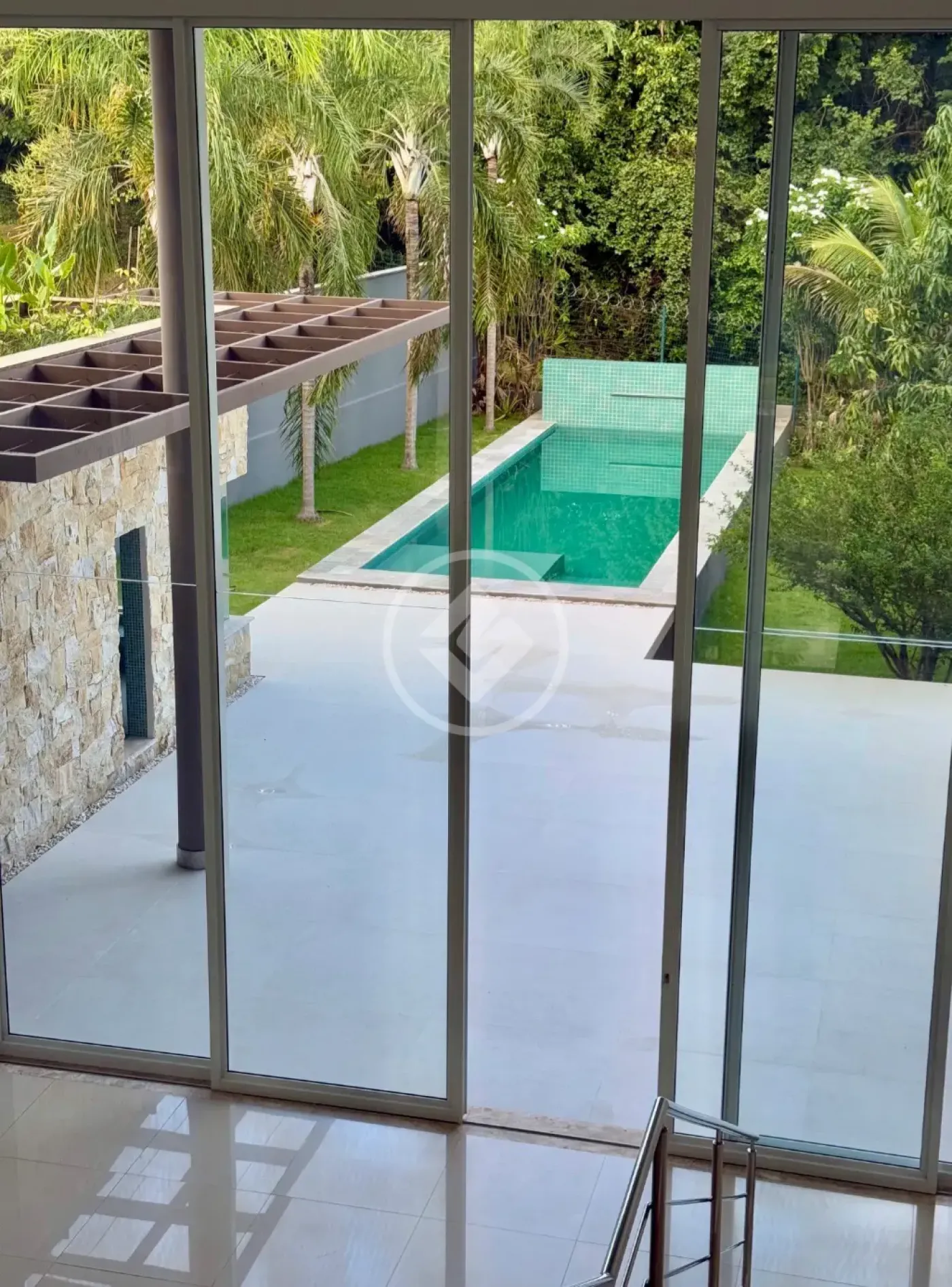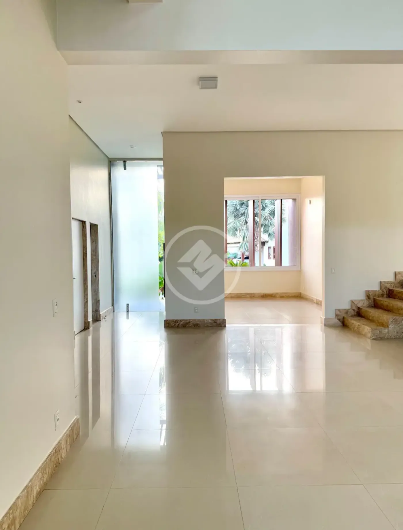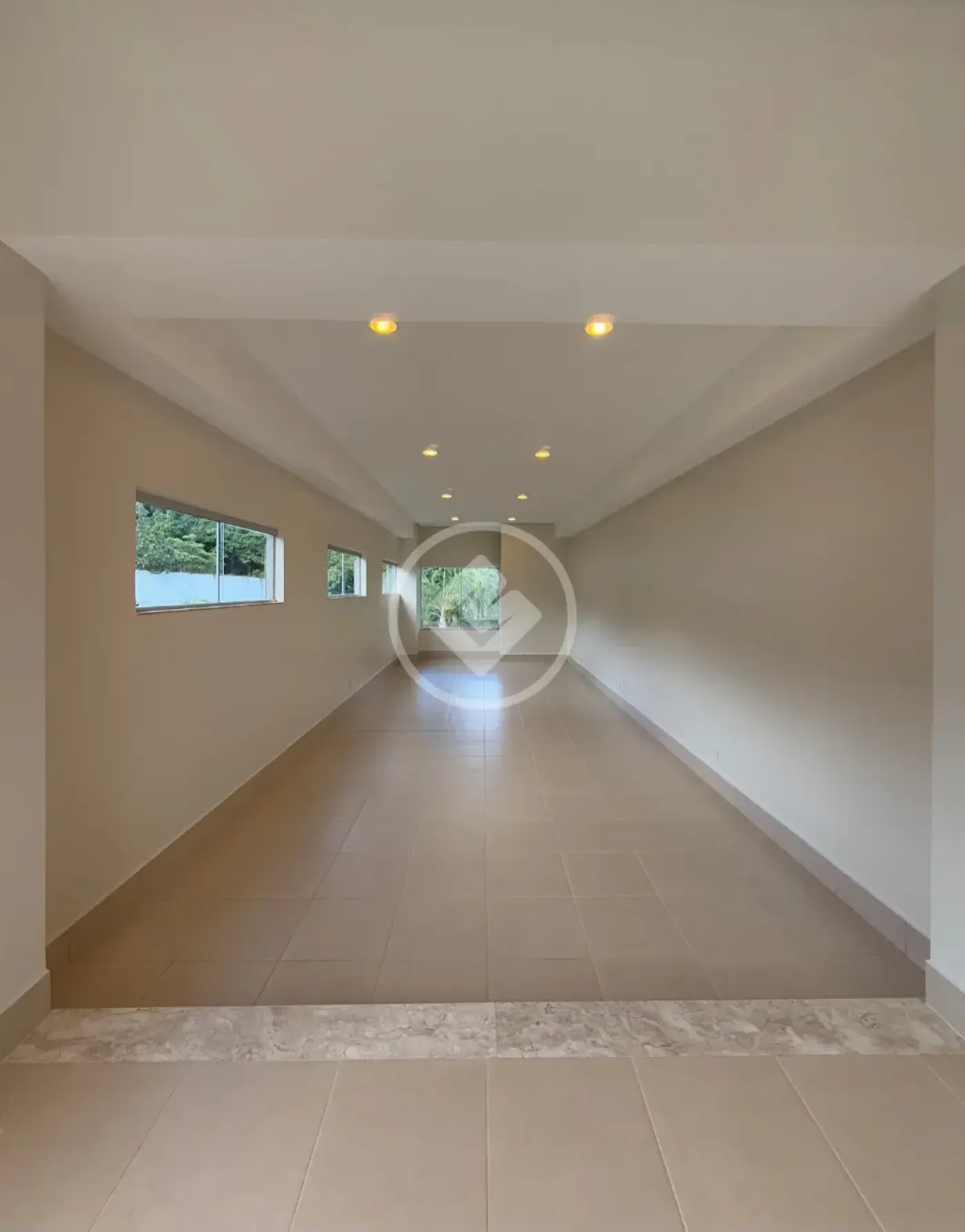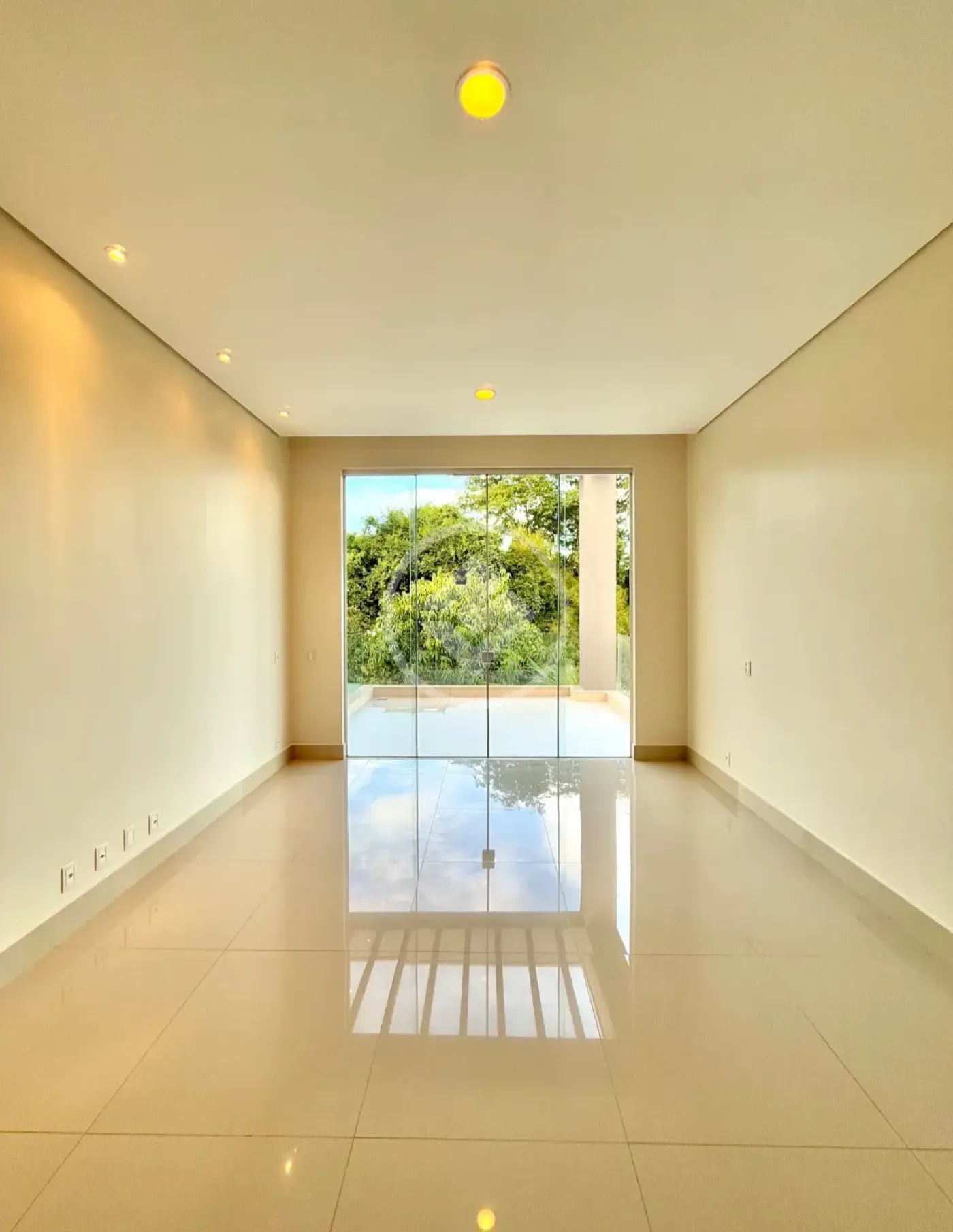 Sala de estar ampla para 4 ambientes, com 91m² e pé-direito de 7,60m, proporcionando grande luminosidade e sensação de espaço.