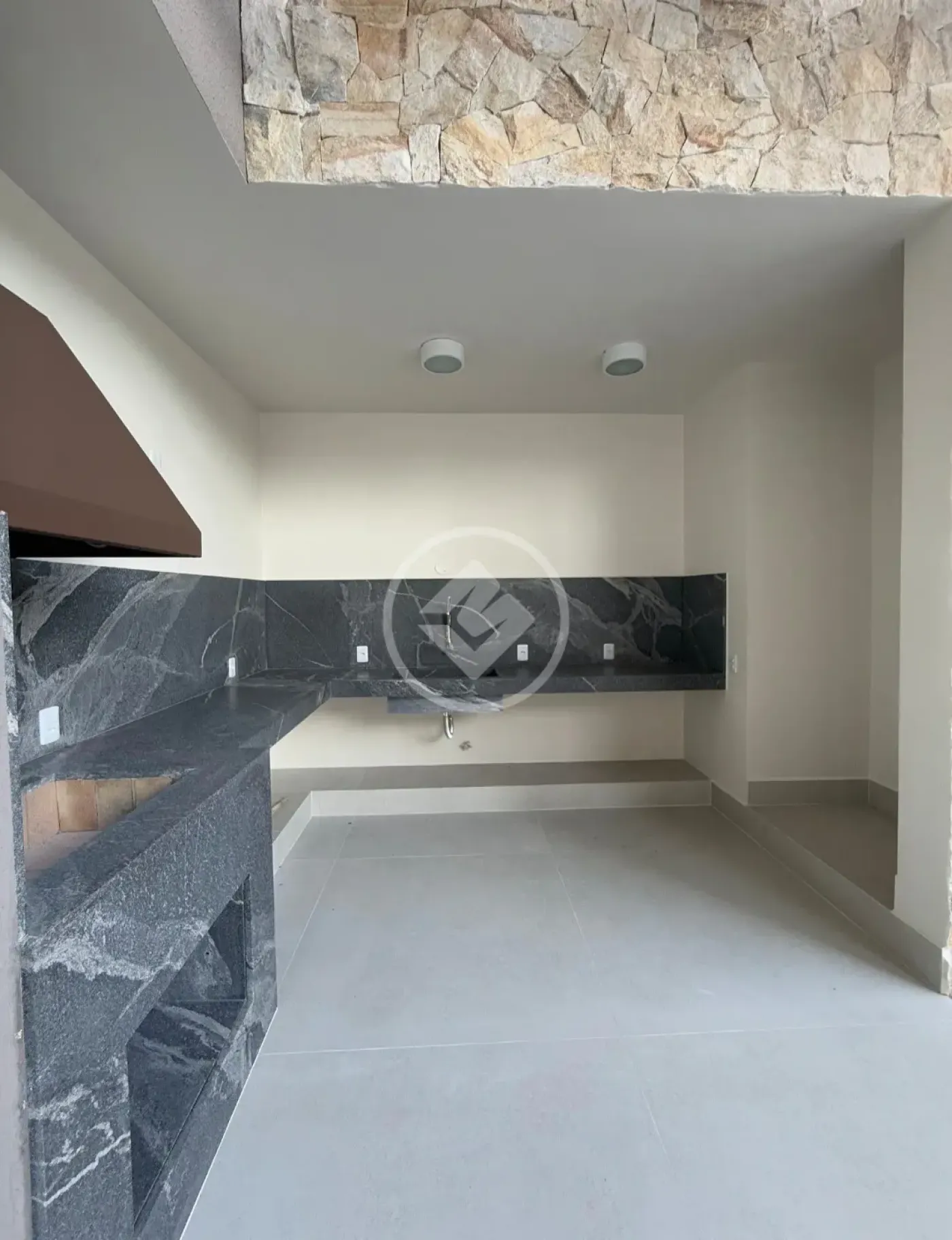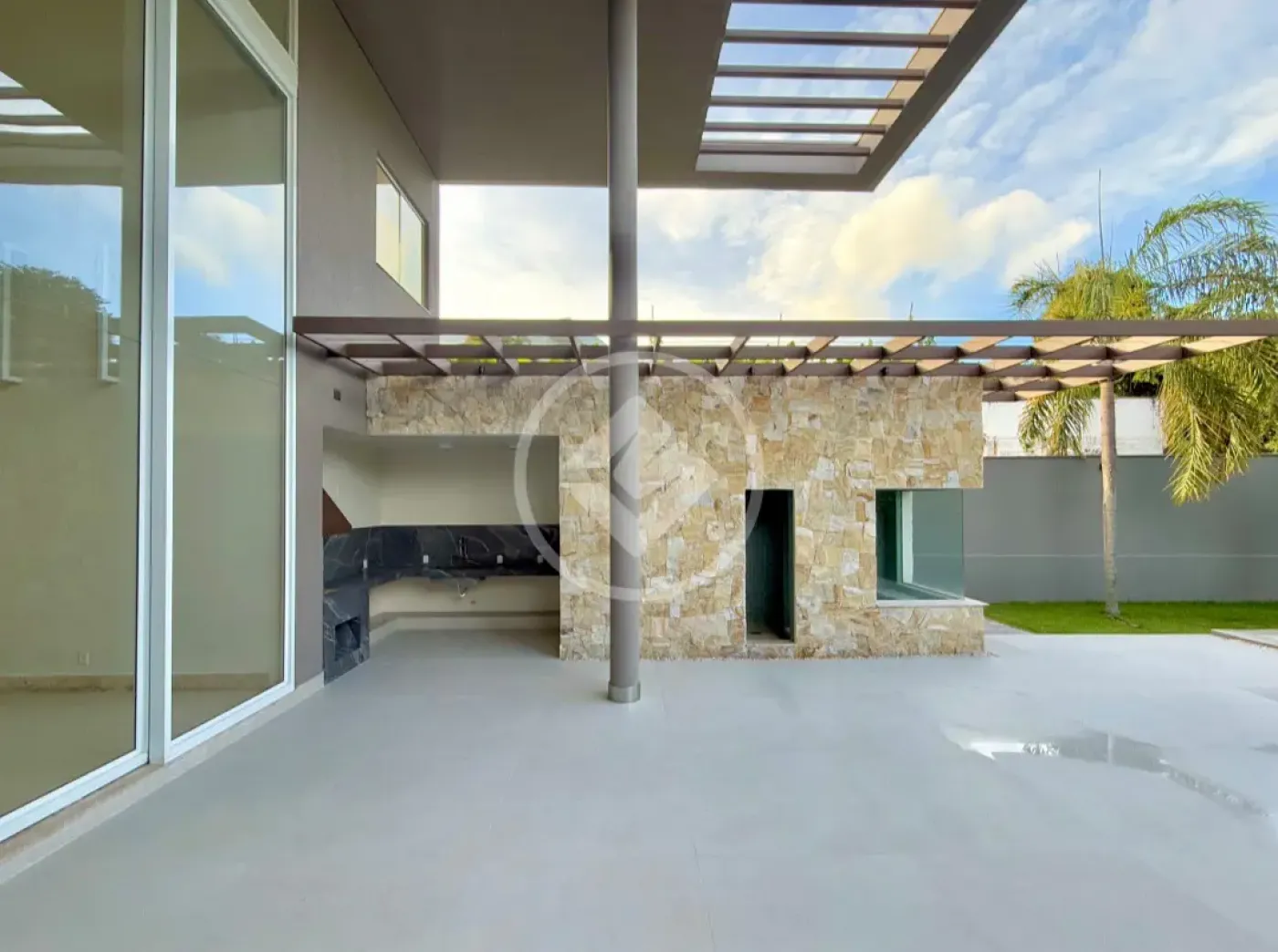 Varanda gourmet de 90m², equipada com churrasqueira a carvão e pé-direito de 7,80m, ideal para receber amigos e familiares.