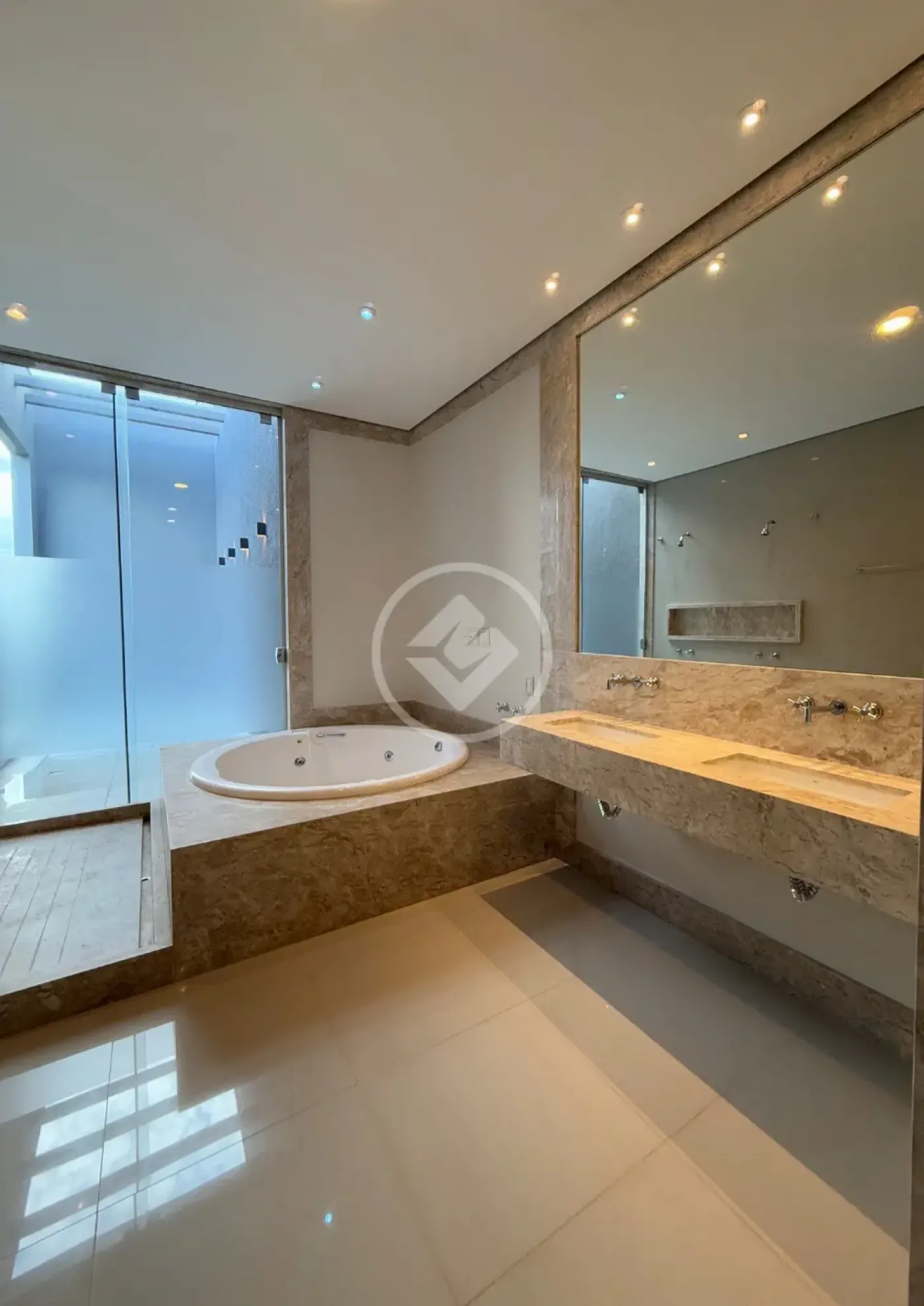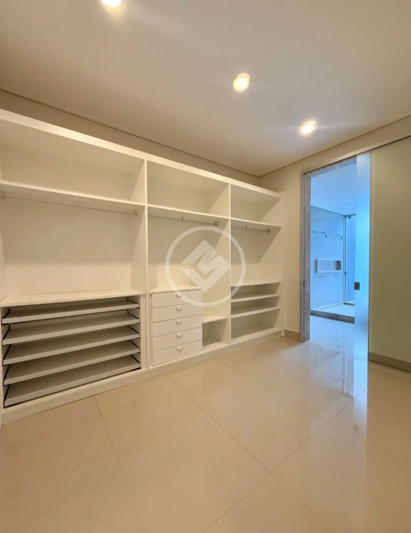 Closet com armários planejados e banho master com jardim de inverno, para um toque de tranquilidade e sofisticação.