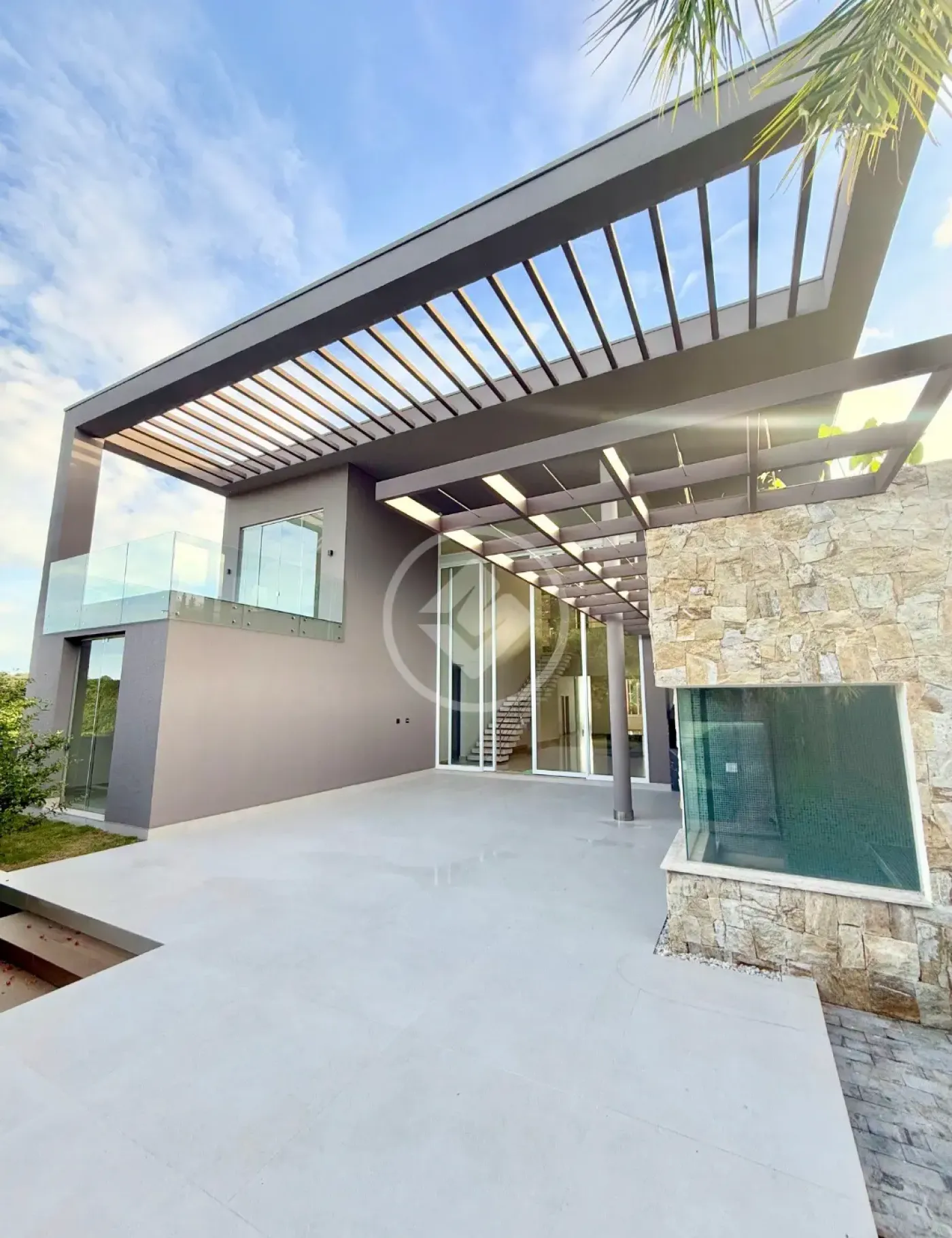 Suíte master com 89m², espaço para copa íntima, pé-direito de 3,60m e varanda com vista para a mata, proporcionando total privacidade e conforto.