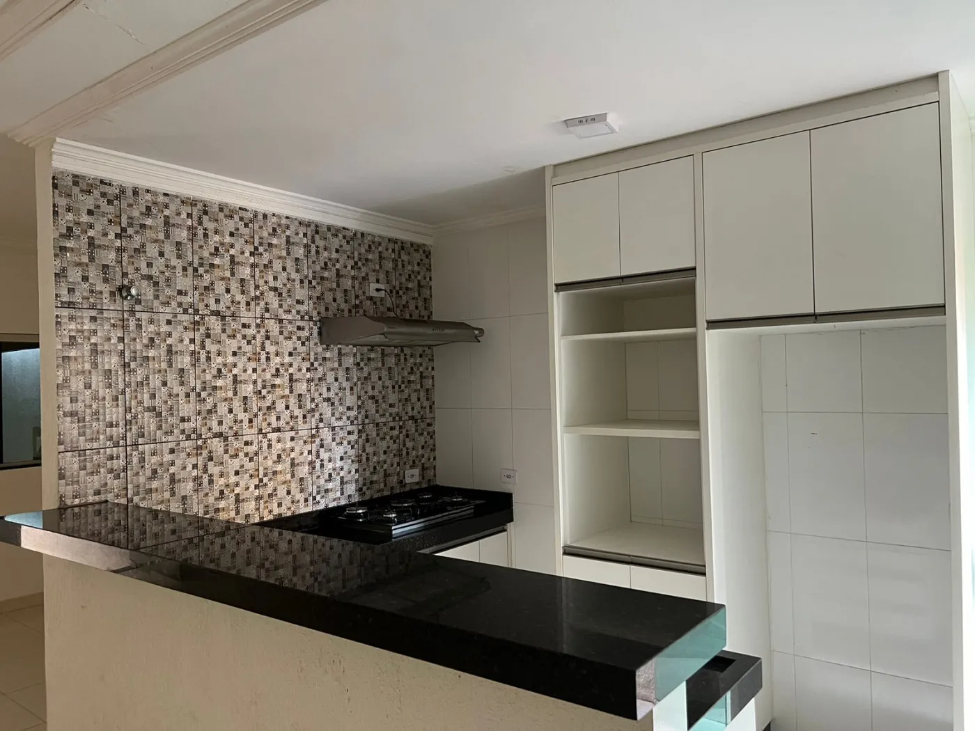 Cozinha integrada, completa em armários, com cooktop