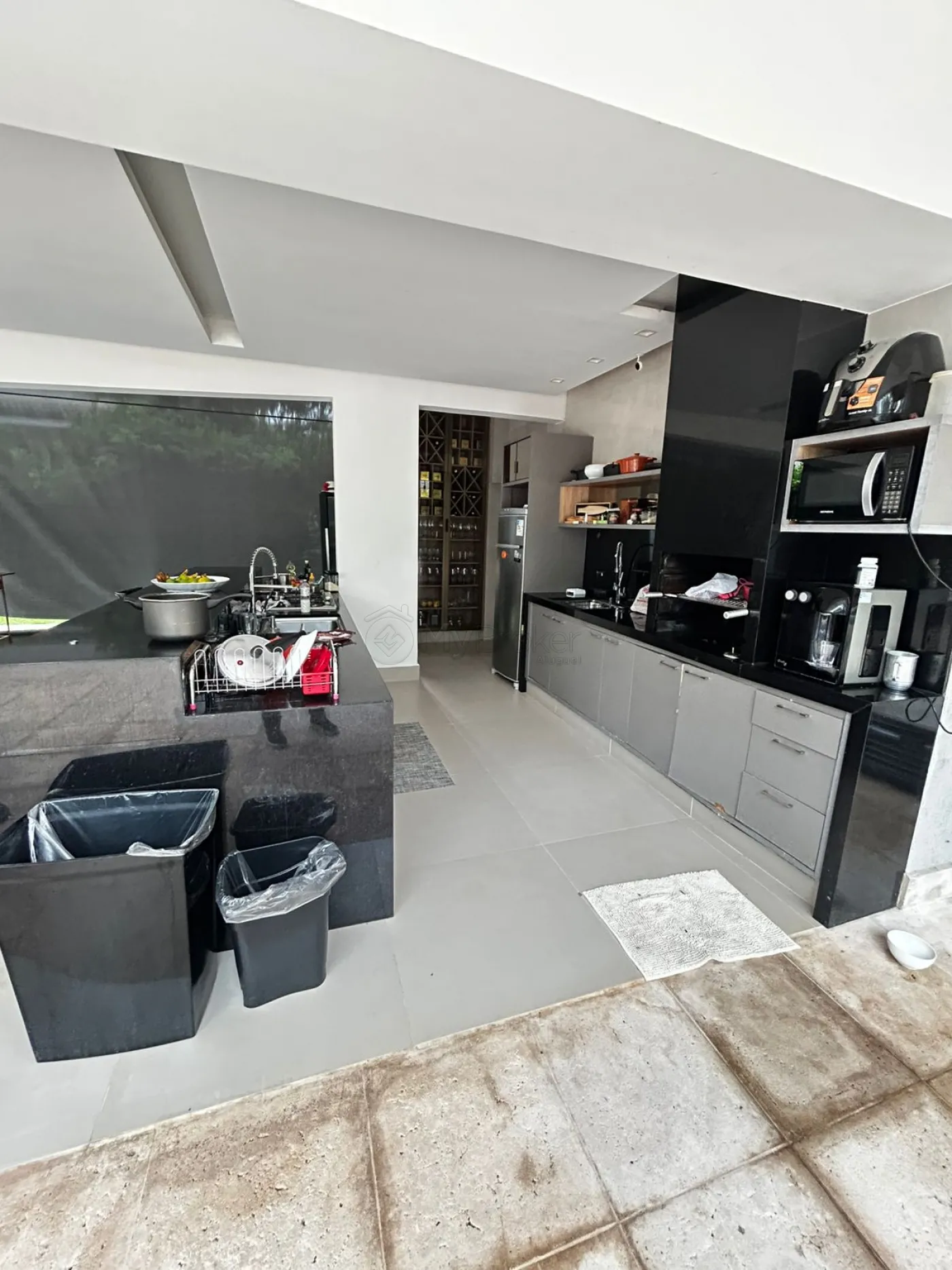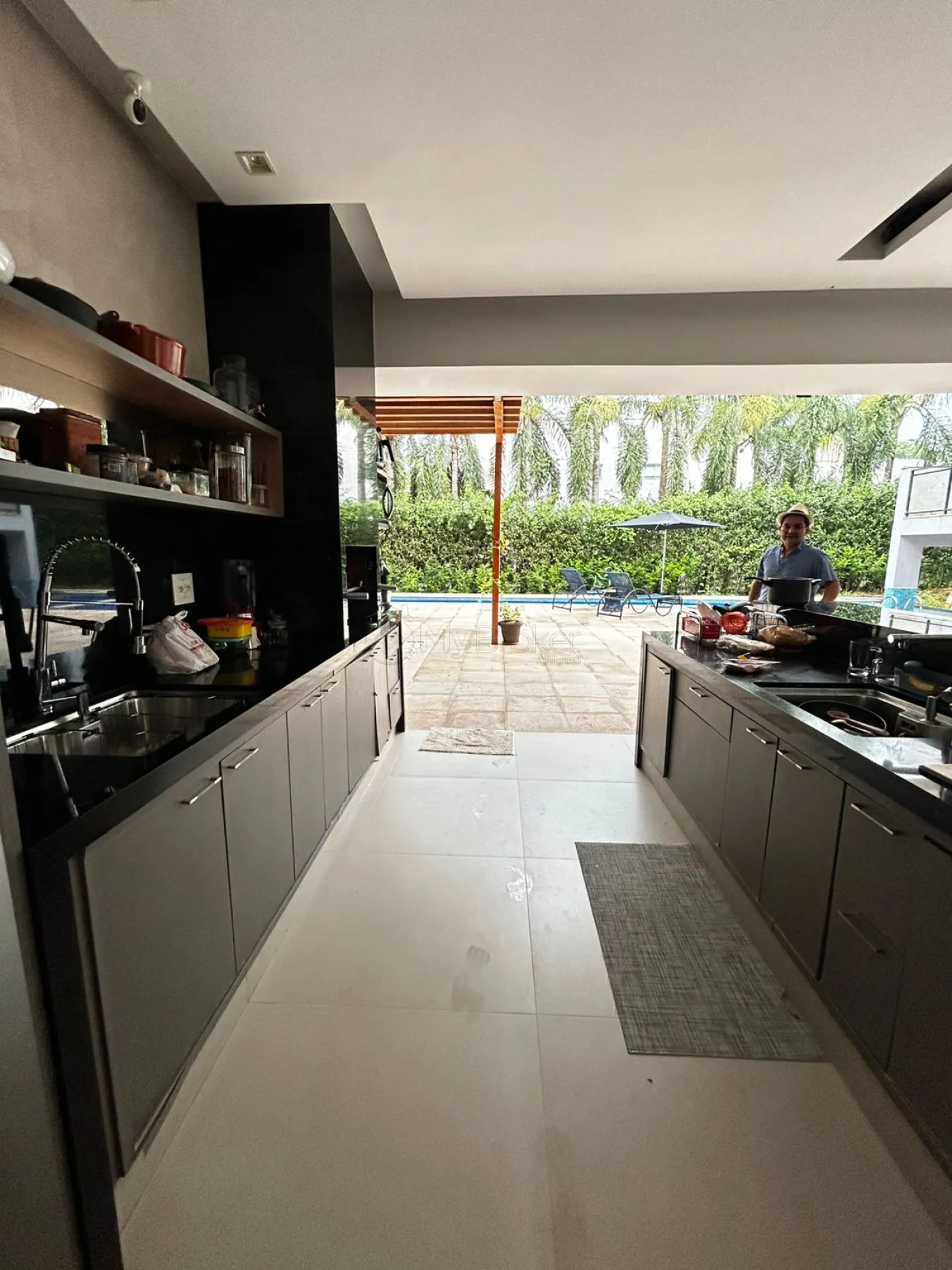 A cozinha é integrada à varanda gourmet, com bancadas e ilha em granito Preto Semi-Absoluto. A área de lazer é revestida com cimentício atérmico da Via Mure.