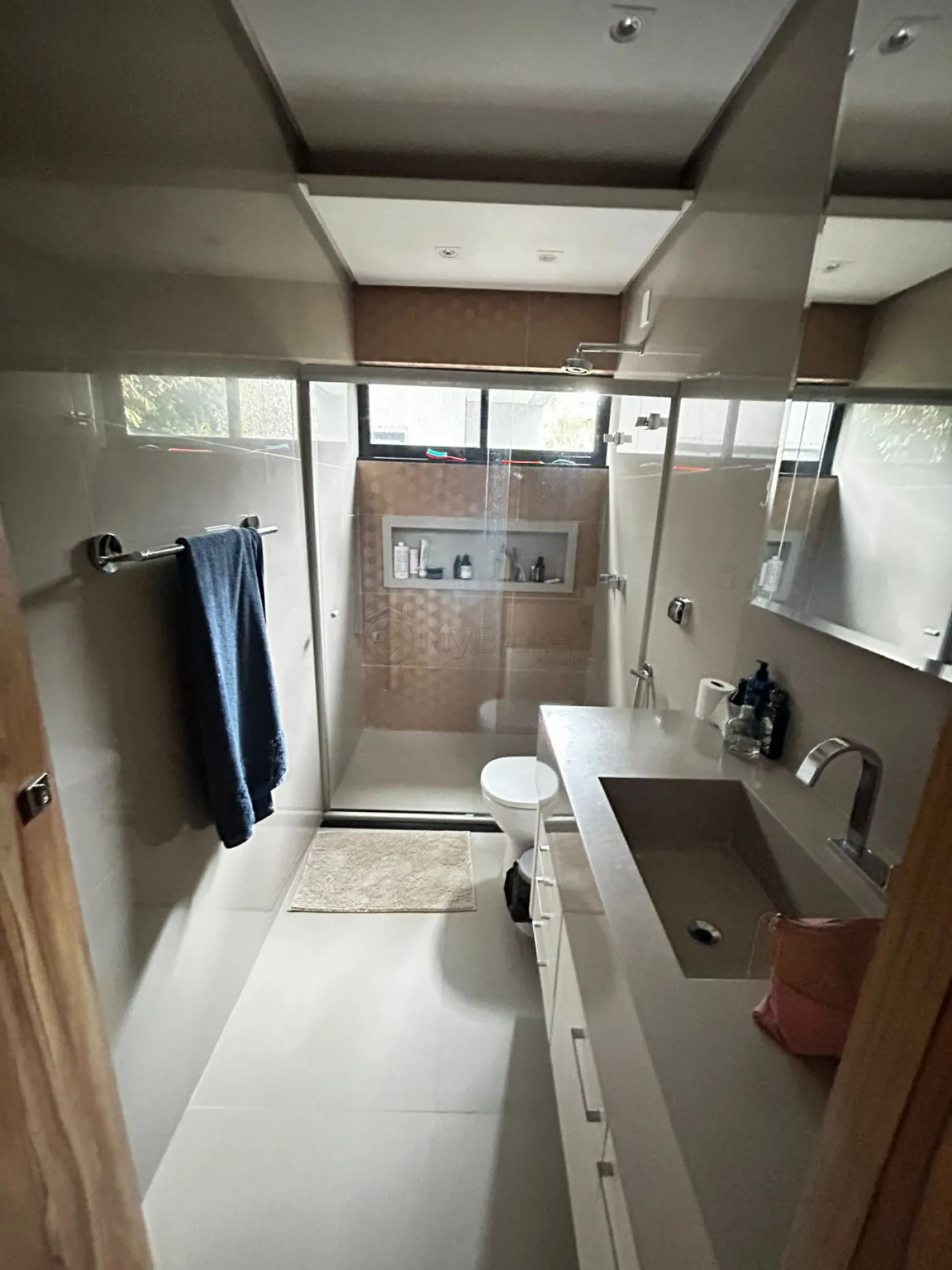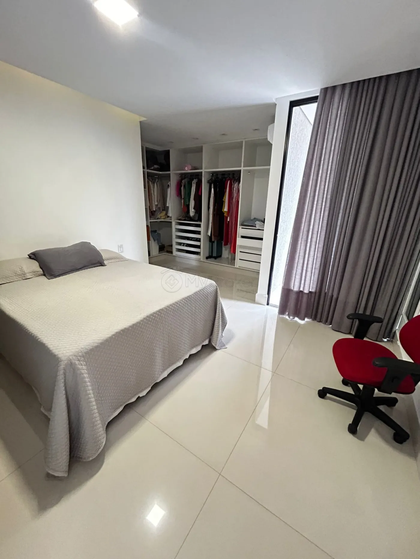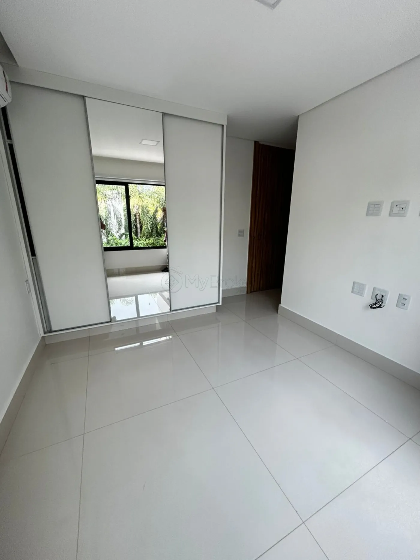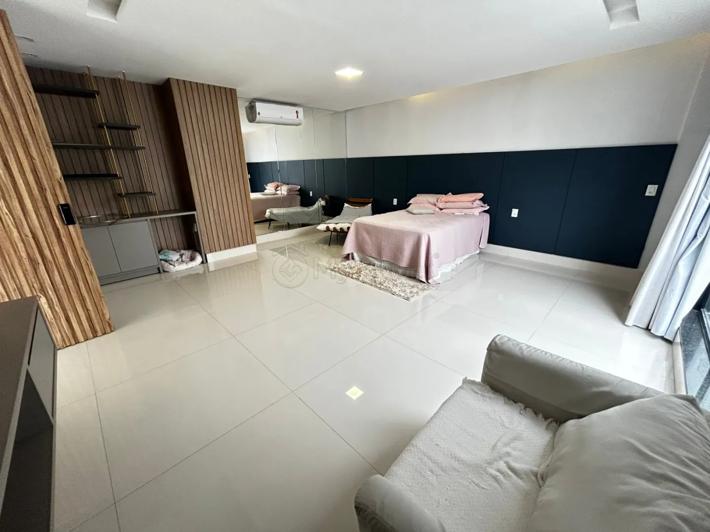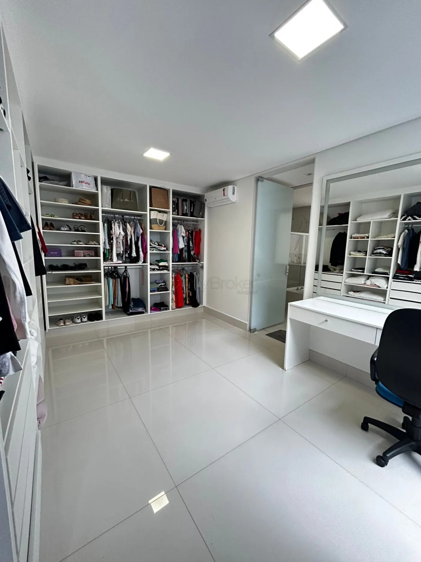 São 4 suítes, todas com ar-condicionado instalado. A suíte master possui aproximadamente 100 m², distribuídos entre sala íntima exclusiva, closet, dormitório e sala de banho. O banheiro da suíte master conta com revestimentos em grandes formatos nas dimensões de 1,20 m x 2,40 m e banheira.