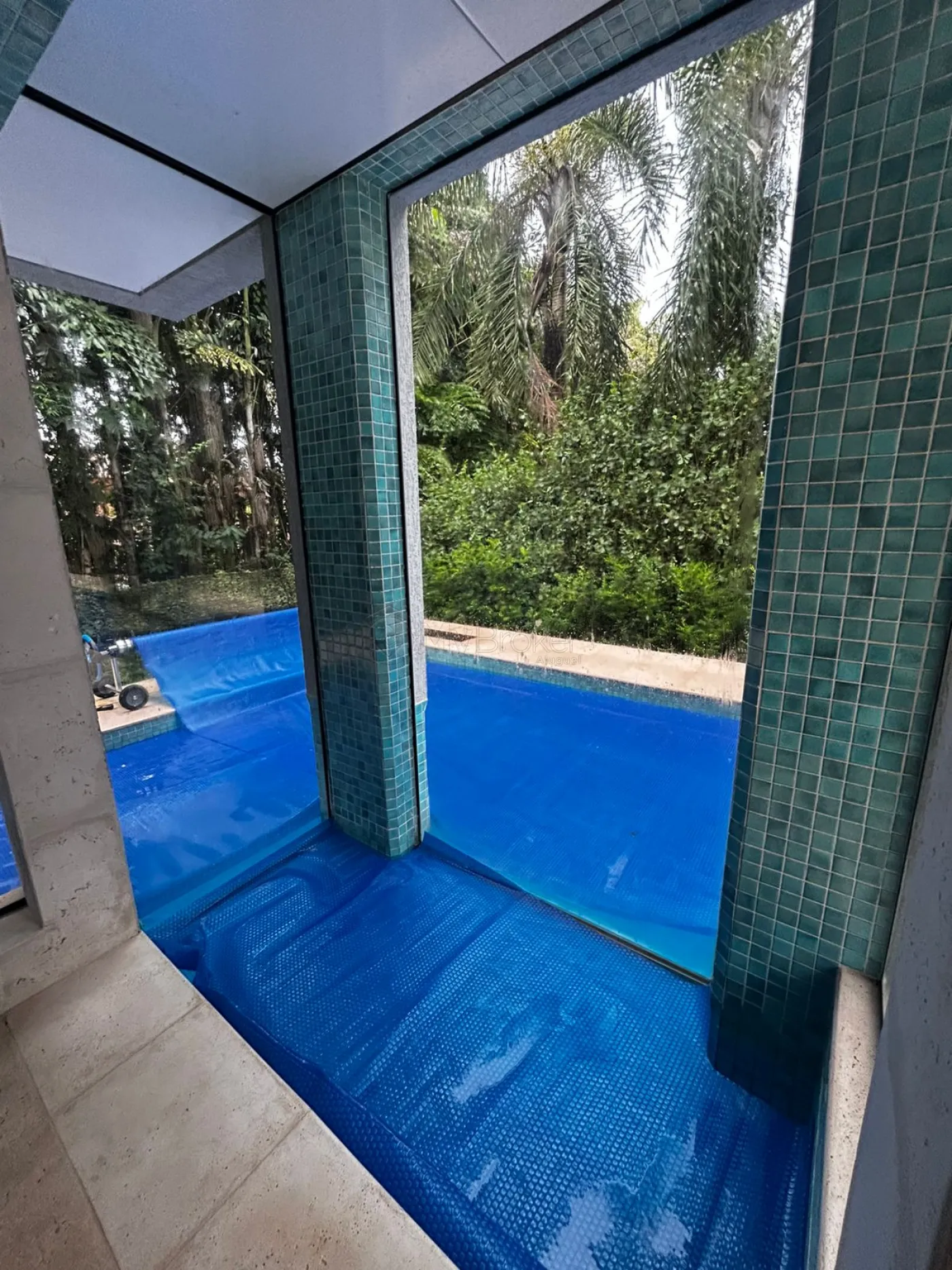 A piscina é revestida em pastilhas da Atlas, na cor Verde Loulé, com vidro que proporciona visibilidade da parte submersa, além de iluminação e aquecimento solar. O imóvel também conta com ofurô com iluminação, aquecimento solar e sistema de hidromassagem, além de sauna molhada com acesso direto à piscina.
