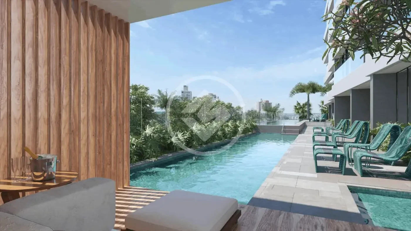 O ambiente de lazer com pé-direito alto, com ventilação direta e iluminação natural. Mais de 185 m² de piscinas interligadas, um verdadeiro Oasis Urbano cercado por água, natureza e design.