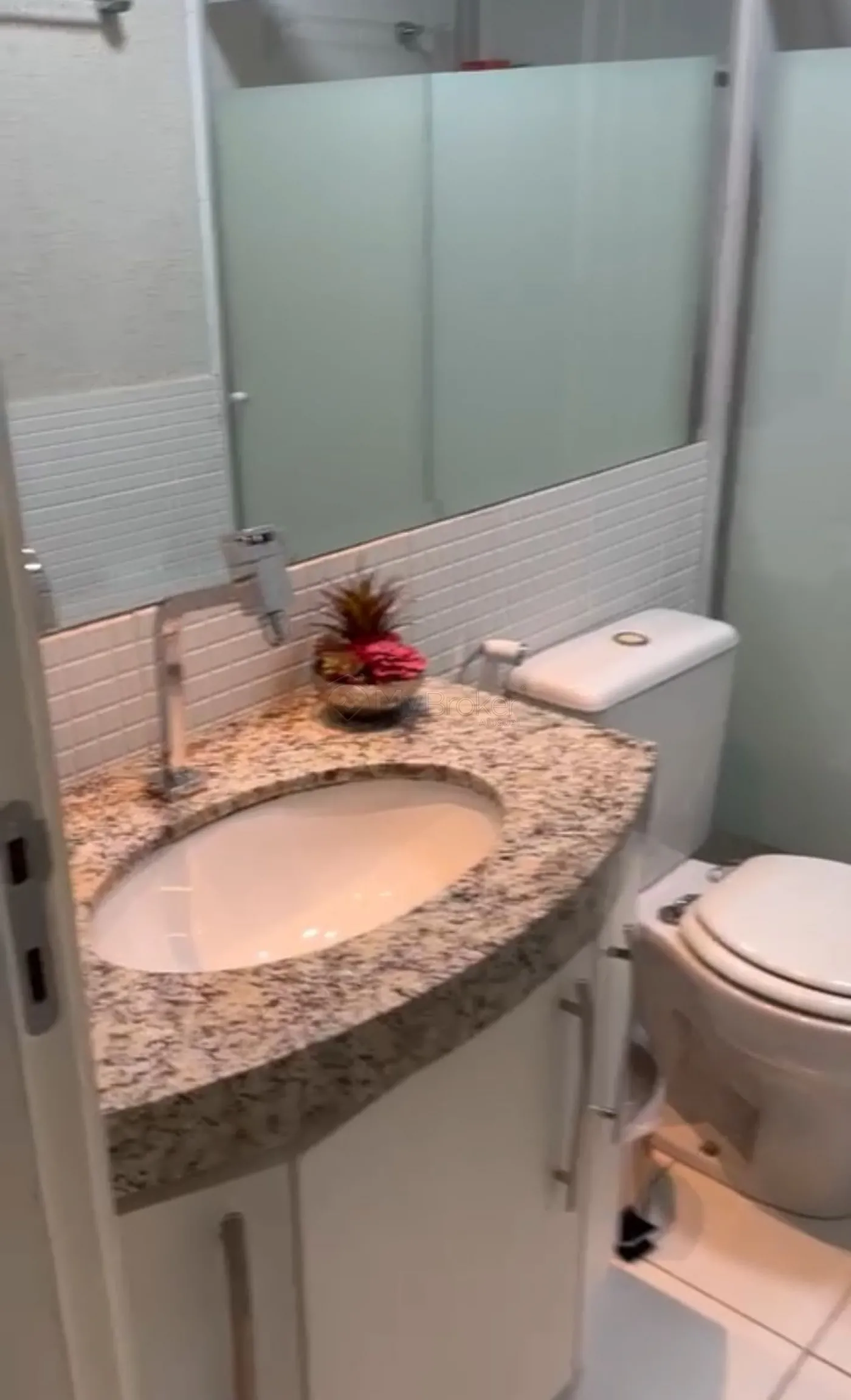 Apartamento 2 quartos sendo 1 suíte , banheiro social , ar condicionado, projeto de marcenaria , completo em armários ,Cristaleira completa com taças, armário para bebidas quentes , Quarto com Escritorio , Cozinha completa com eletrodomésticos , sala com iluminação , acabamento em gesso , sofá , mesa de centro , mesa de quatro lugares . O Imovel e mobiliado porém está sem televisão .